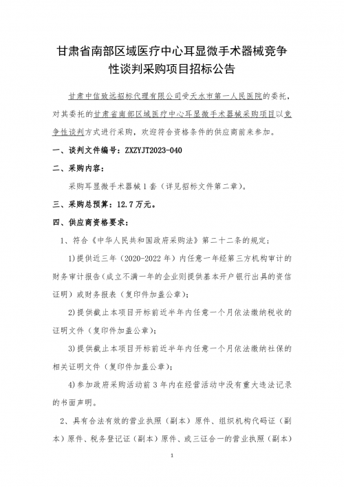 甘肃省南部区域医疗中心耳显微手术器械竞争性谈判采购项目招标公