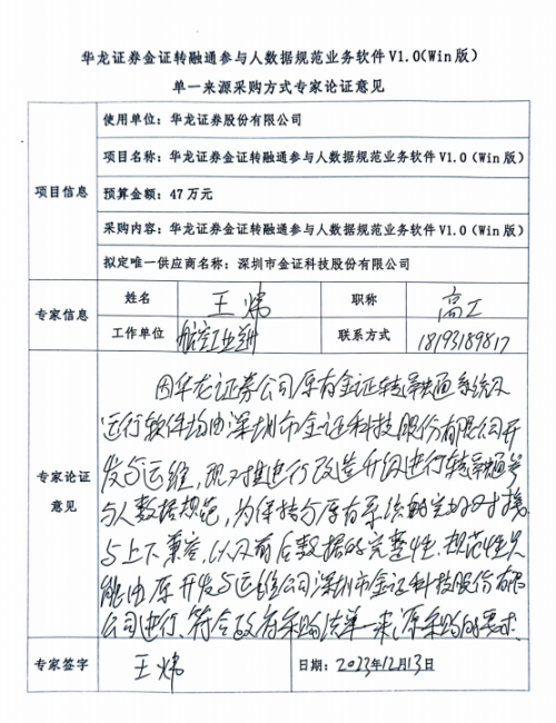 唯一性:华龙证券公司与深圳市金证科技股份有限公司合作长达20几年,以上核心系统均由金证公司开发提供,且原核心系统也是由金证提供,由于转融通参与人数据规范业务的发展需要与以上原系统有着紧密的关联关系,所以现金证转融通参与人数据规范业务软件V1.0需要结合华龙证券原有的核心系统进行改造,技术层面上可以与金证转融通参与人数据规范业务软件V1.0各功能快速而精准对接金证原系统上线来满足现在的业务需求。