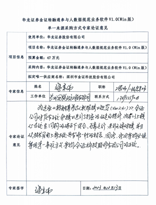 根据以上核心系统是金证提供特点而言,在同构的体系下,系统间熟悉程度对接较高,大大降低三方系统的沟通联调等对接时间,我司拟进行单一来源方式采购深圳市金证科技股份有限公司的金证转融通参与人数据规范业务软件V1.0,为了提高工作效益和防范异购而引起不必要的安全风险。