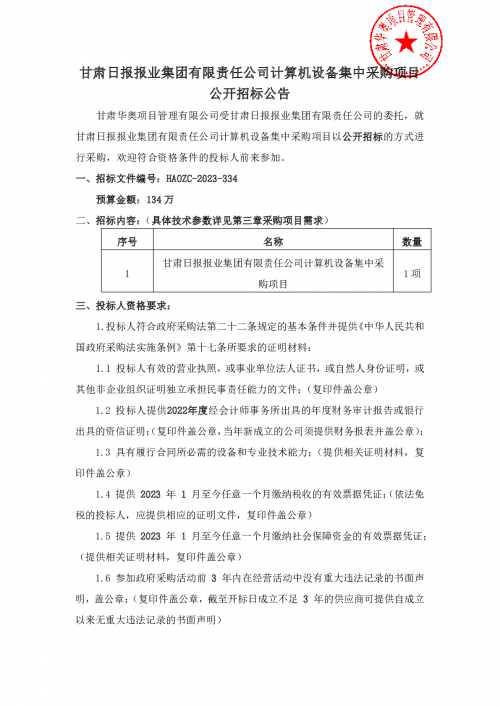 甘肃日报报业集团有限责任公司计算机设备集中采购项目公开招标公
