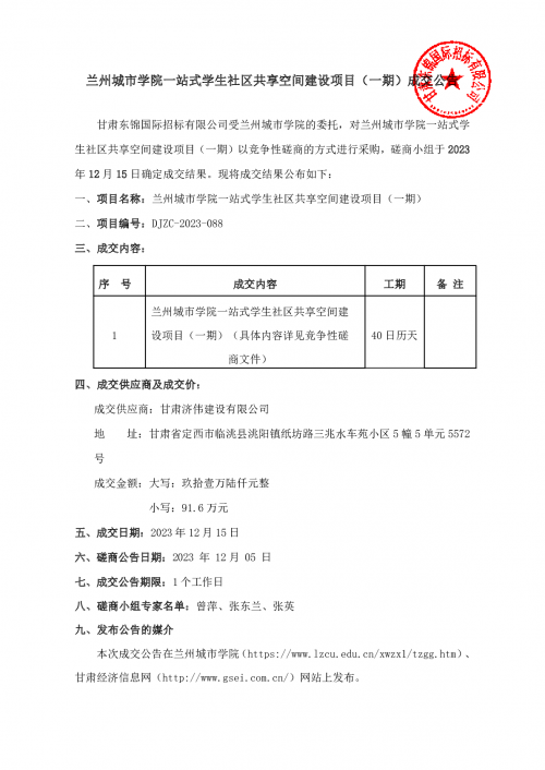 兰州城市学院一站式学生社区共享空间建设项目(一期)成交公告