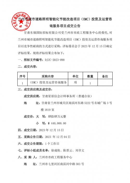 兰州市城市道路照明智能化节能改造项目(EMC)投资及运营咨询服务项目成交公告