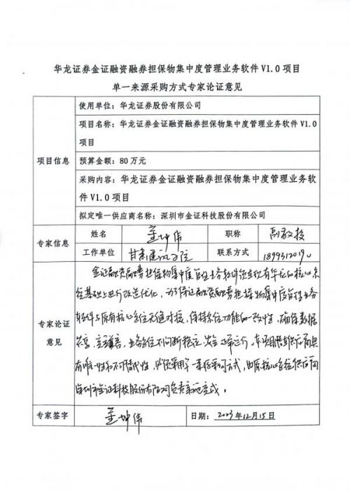 唯一性:华龙证券公司与深圳市金证科技股份有限公司合作长达20几年,以上核心系统均由金证公司开发提供,且原核心系统也是由金证提供,由于融资融券担保物集中度管理业务)的发展需要与以上原系统有着紧密的关联关系,所以现金证融资融券担保物集中度管理业务软件V1.0)需要结合华龙证券原有的核心系统进行改造,技术层面上可以与金证融资融券担保物集中度管理业务软件V1.0)各功能快速而精准对接金证原系统上线来满足现在的业务需求。