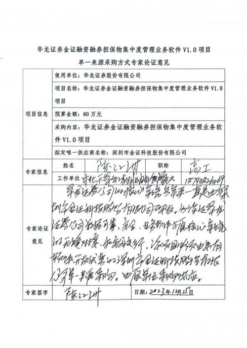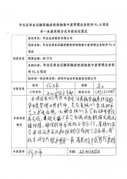 (二)项目名称:华龙证券金证融资融券担保物集中度管理业务软件V1.0项目