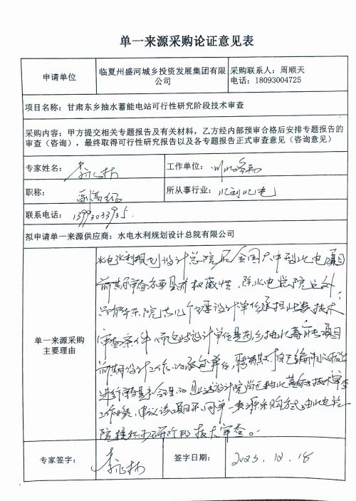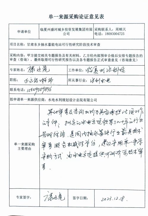 甘肃东乡抽水蓄能电站可行性研究阶段技术审查项目采用单一来源方式进行服务采购,现将有关情况予以公示: