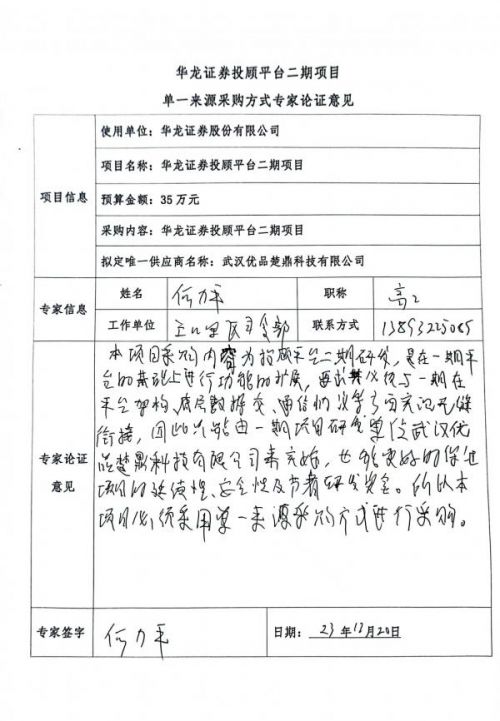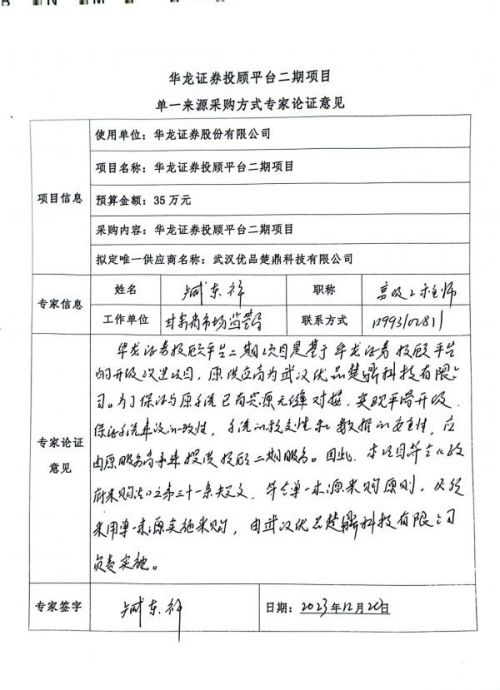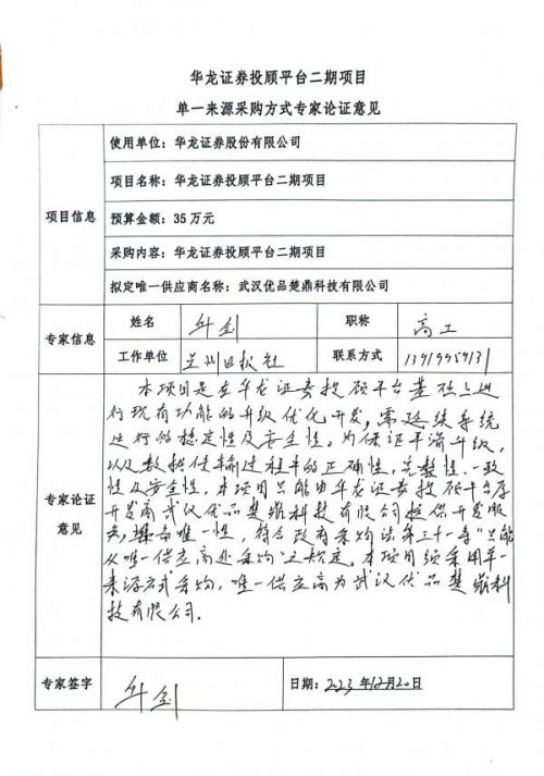 根据以上特点,我公司拟进行单一来源方式采购华龙证券投顾平台二期项目,涉及APP订单支付、投顾平台管理端、投顾平台投顾端改造,包含投顾平台黑名单管理、投顾平台外部资讯签约管理、APP端用户外部资讯签约、投顾平台工作底稿栏目新增、APP端新增保证金支付及投顾/管理端保证金订单管理,以进一步完善华龙证券投顾平台功能建设。