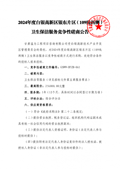 2024年度白银高新区银东片区(109线两侧) 卫生保洁服务竞争性磋