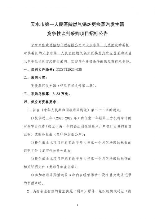 天水市第一人民医院燃气锅炉更换蒸汽发生器竞争性谈判采购项目招