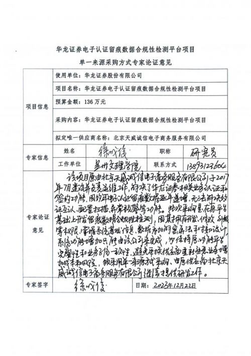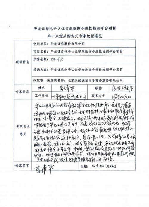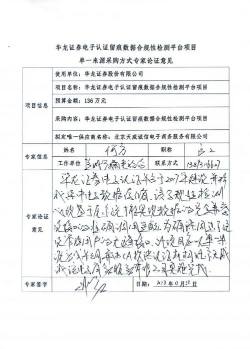 根据以上特点,我公司拟进行单一来源方式采购北京天威诚信电子商务服务有限公司电子认证留痕数据合规性检测平台产品,以进一步完善、提升华龙证券电子认证留痕数据合规性检测方面的能力。