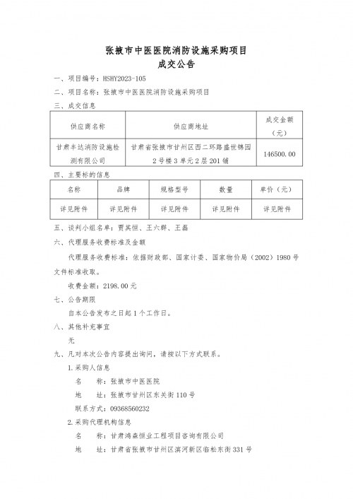 张掖市中医医院消防设施采购项目成交公告