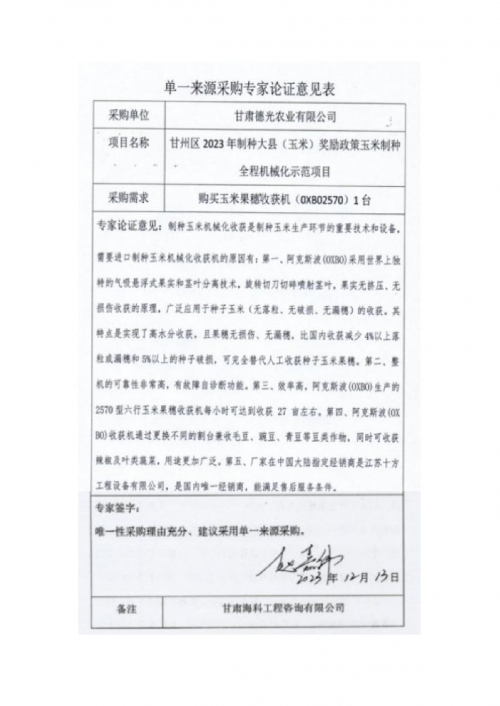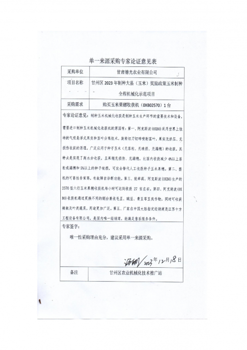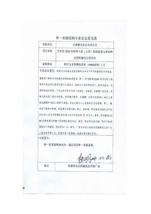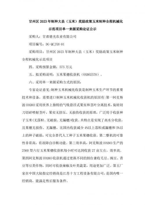 甘州区2023年制种大县(玉米)奖励政策玉米制种全程机械化示范项目单一来源采购论证公示