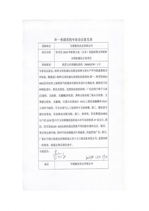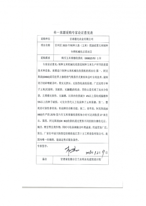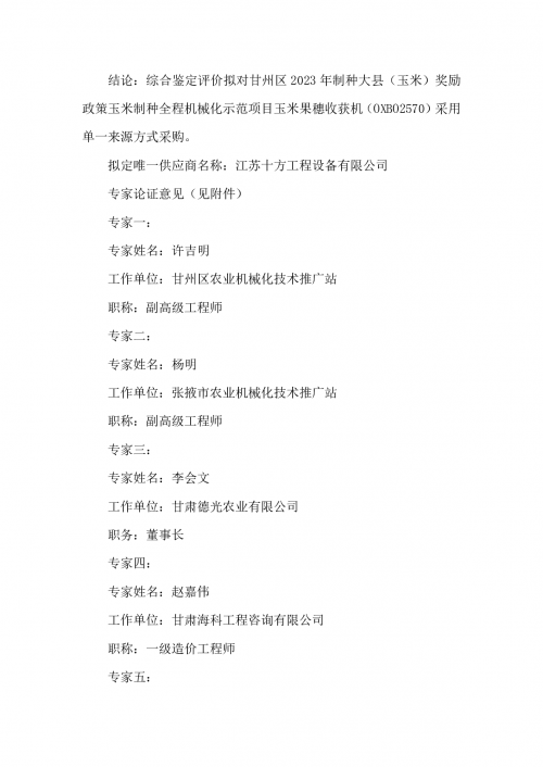 甘州区2023年制种大县(玉米)奖励政策玉米制种全程机械化示范项目单一来源采购论证公示