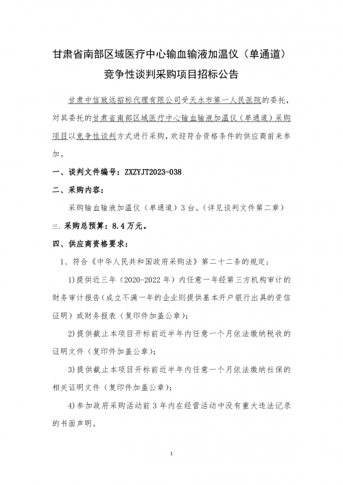 甘肃省南部区域医疗中心输血输液加温仪(单通道)竞争性谈判采购