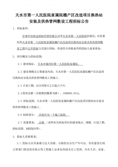 天水市第一人民医院家属院棚户区改造项目换热站安装及供热管网敷设工程招标公告