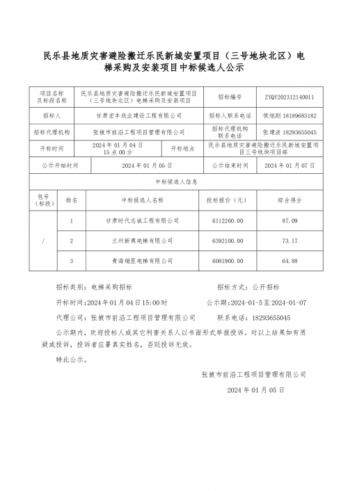民乐县地质灾害避险搬迁乐民新城安置项目(三号地块北区)电梯采购及安装项目中标候选人公示