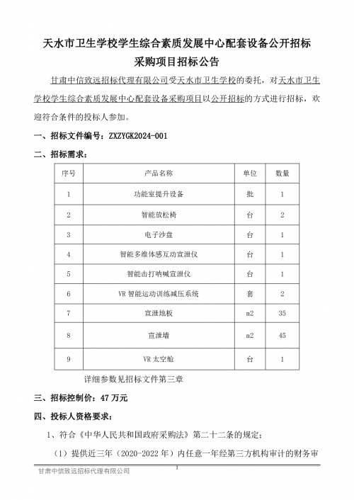 天水市卫生学校学生综合素质发展中心配套设备公开招标采购项目招标公告
