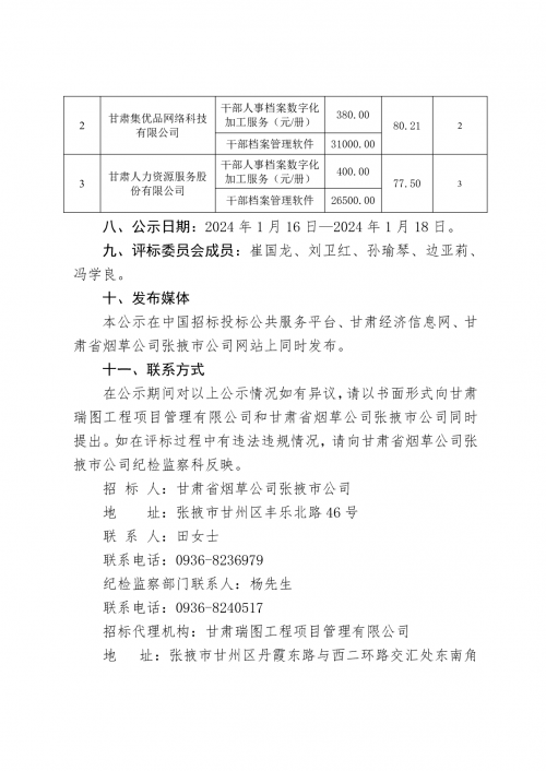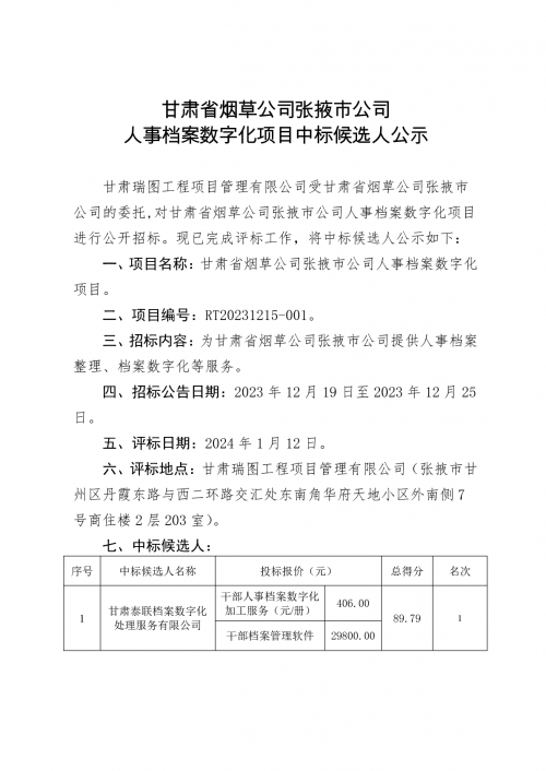 甘肃省烟草公司张掖市公司人事档案数字化项目中标候选人公示