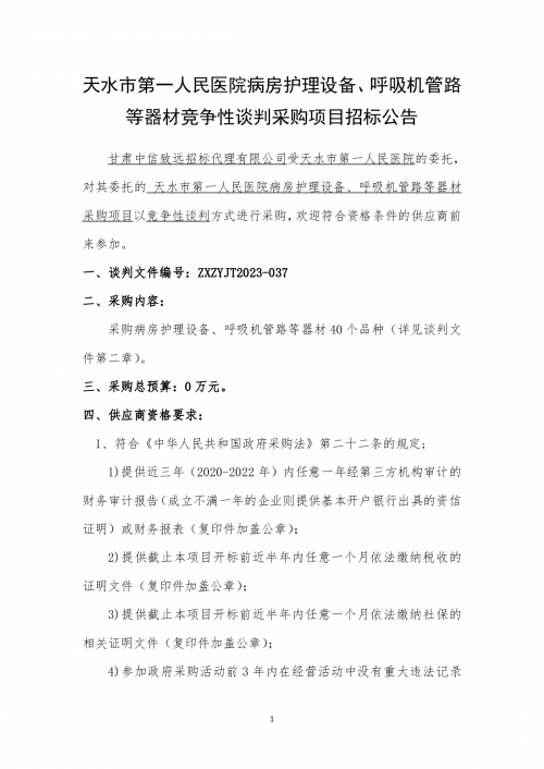天水市第一人民医院病房护理设备、呼吸机管路等器材竞争性谈判采购项目招标公告