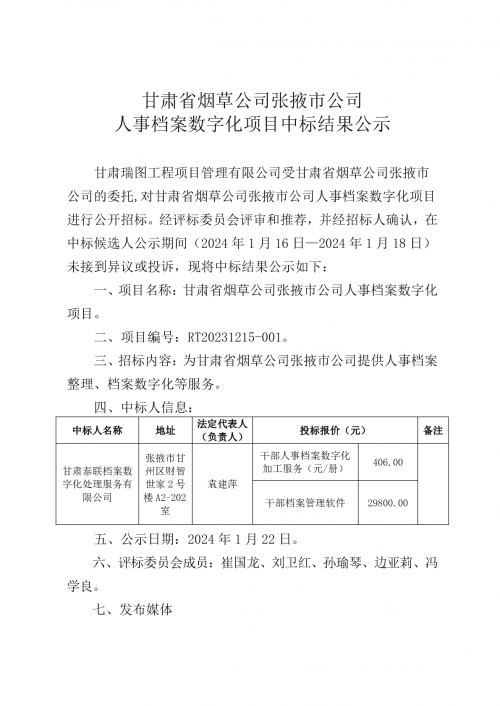 甘肃省烟草公司张掖市公司人事档案数字化项目中标结果公示