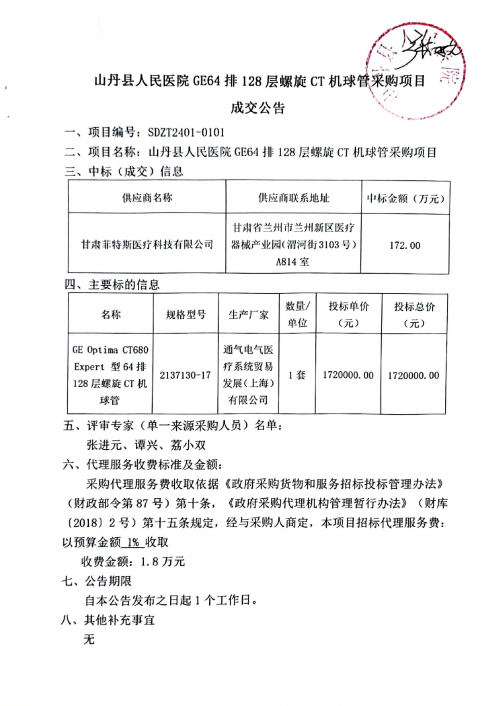 山丹县人民医院GE64排128层螺旋CT机球管采购项目单一来源成交公