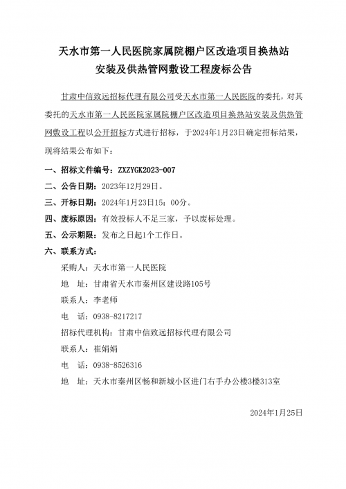天水市第一人民医院家属院棚户区改造项目换热站安装及供热管网敷设工程废标公告