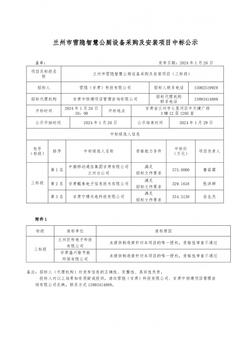 兰州市雪隐智慧公厕设备采购及安装项目中标公示