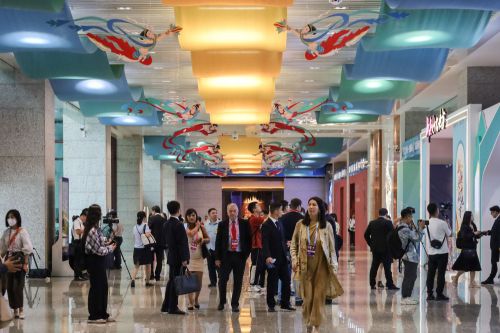 2023年9月6日,与会嘉宾在第六届丝绸之路(敦煌)国际文化博览会上参观。新华社记者 马希平 摄