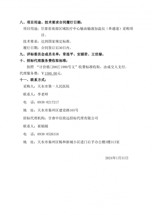 甘肃省南部区域医疗中心输血输液加温仪(单通道)竞争性谈判采购