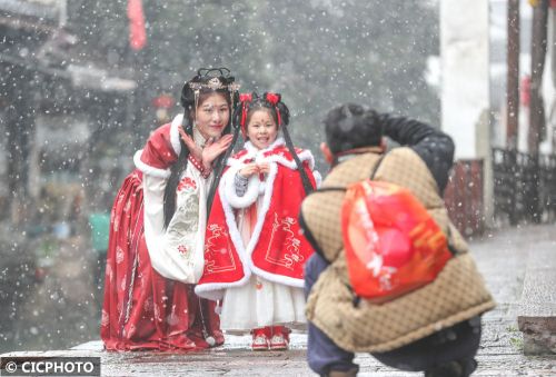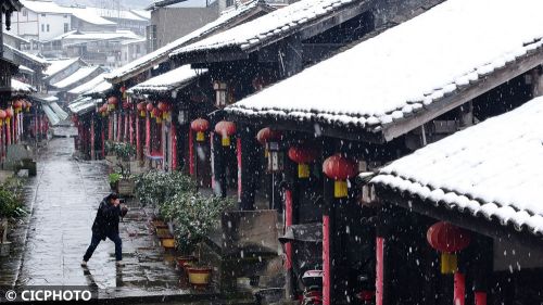 ↑2024年1月22日,游人在浙江省东阳市横店影视城清明上河图景区赏雪游玩。CICPHOTO/吴意琼 摄