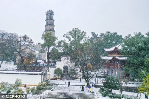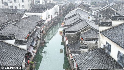 ↑2024年2月6日在浙江省湖州市南浔古镇景区拍摄的雪景。CICPHOTO/陆志鹏 摄