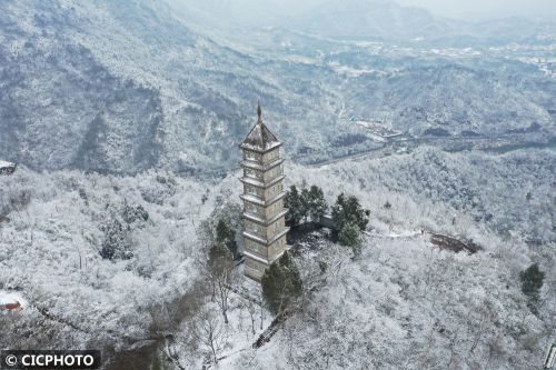 ↑2024年1月24日在四川省阆中市拍摄的明代白塔雪景。(无人机照片)CICPHOTO/王玉贵 摄