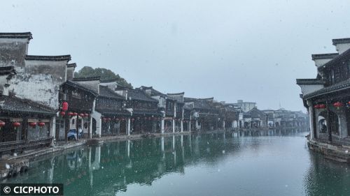 ↑2024年2月6日,游人在浙江省湖州市德清县新市古镇赏雪拍照。CICPHOTO/王树成 摄