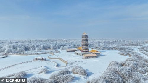↑2024年1月22日,游人在湖南省永州市蓝山县塔下寺文化公园赏雪游玩。(无人机照片)CICPHOTO/彭华 摄