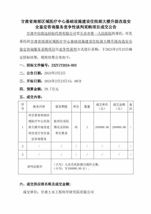 甘肃省南部区域医疗中心基础设施建设住院部大楼升级改造安全鉴定咨询服务竞争性谈判采购项目成交公告