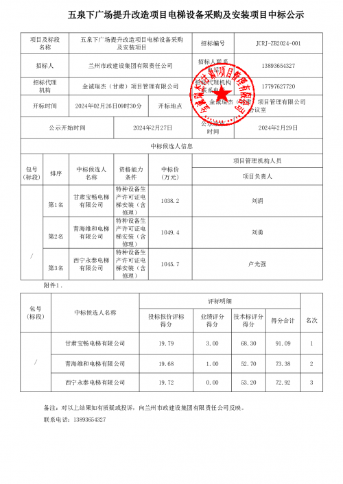 兰州市五泉下广场提升改造项目电梯设备采购及安装项目