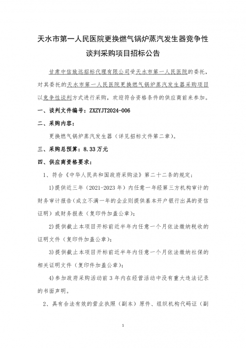 天水市第一人民医院更换燃气锅炉蒸汽发生器竞争性谈判采购项目招
