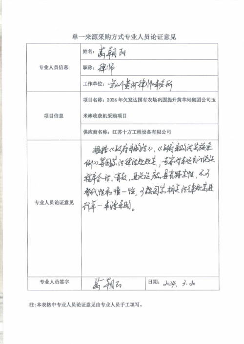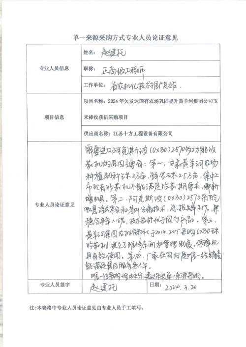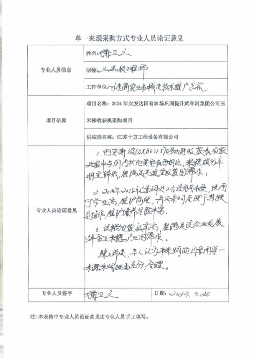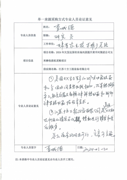 采用单一来源采购方式的原因及说明:(1)阿克斯波(OXBO)2570多功能收获机采用世界上独特的气吸悬浮式果实和茎叶分离技术,旋转切刀切碎喷射茎叶,果实无挤压、无损伤收获的原理,广泛用于收获甜糯玉米鲜棒、制种玉米(无落粒、无破损、无漏穗)收获。(2)黄羊河集团农机合作社已于2014、2015年采购2台OXBO 玉米棒收获机,使用效果良好,特别适合公司甜糯玉米鲜棒收获,使新鲜甜 糯玉米产品收获加工时效性得到保障,实现了甜糯玉米产品品质更高;进一步降低农产品收获破损率,实现了加工效率和农户种植效益双提升。 目前国内其他鲜食玉米加工企业均采购的是OXBO玉米棒收获机,业内普及程度高,口碑良好。(3)玉米收获机整机的可靠性非常高,有故障自诊断功能,同时黄羊河集团农机合作社已使用阿克斯波(OXBO) 收获机多年,建立了专业维护 保养车间与完善的管理制度,对该机型的使用维修保养具有丰富的经验和专业的团队,为收获机正常使用具备完整的管理体系和维护保养保障。(4)阿克斯波(OXBO)厂家在中国大陆指定经销商是江苏十方工程设备有限公司,是国内唯一经销商,在国内多处设有分销点和技术维护人员,能满足售后服务条件。