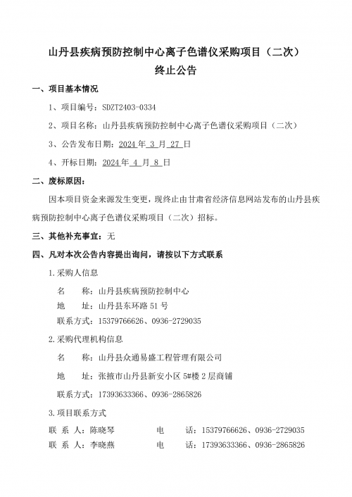 山丹县疾病预防控制中心离子色谱仪采购项目(二次)终止公告