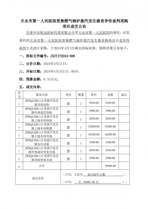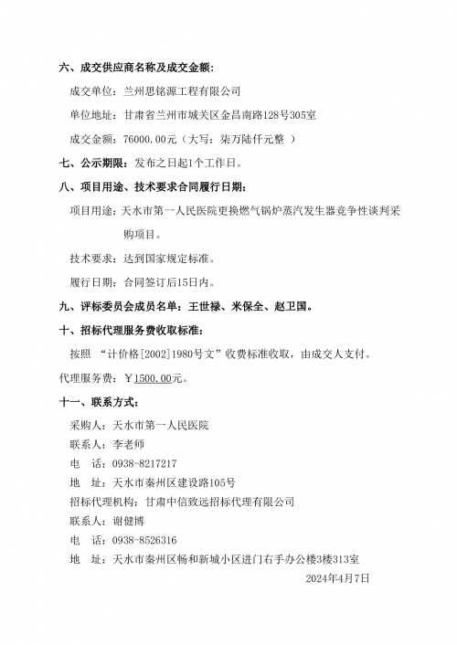天水市第一人民医院更换燃气锅炉蒸汽发生器竞争性谈判采购项目成交公告