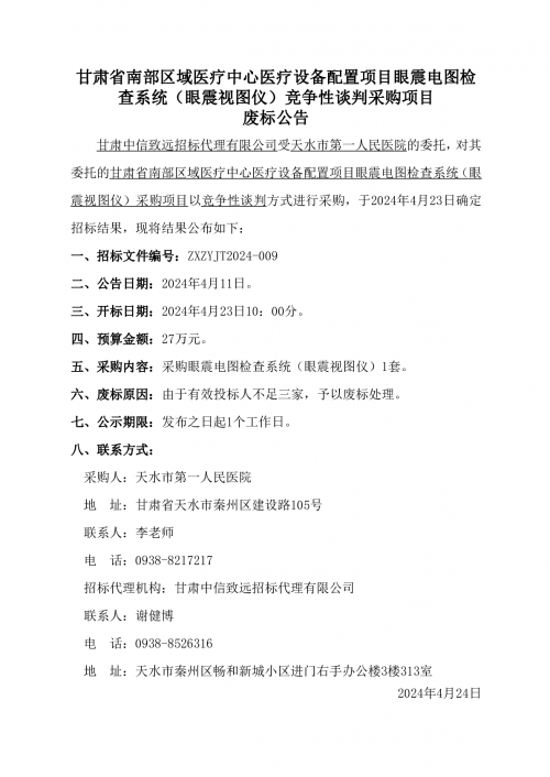 甘肃省南部区域医疗中心医疗设备配置项目眼震电图检查系统(眼震视图仪)竞争性谈判采购项目废标公告