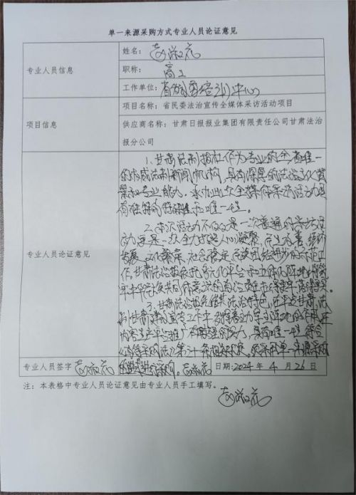 综上,由甘肃法治报社承办此次全媒体采访行具有其独特的特殊性和唯一性,既体现了甘肃法治报社的专业素养和责任意识,也展现了其在推动法治社会建设和铸牢中华民族共同体意识中的积极作用。为此特申请以单一来源方式采购。