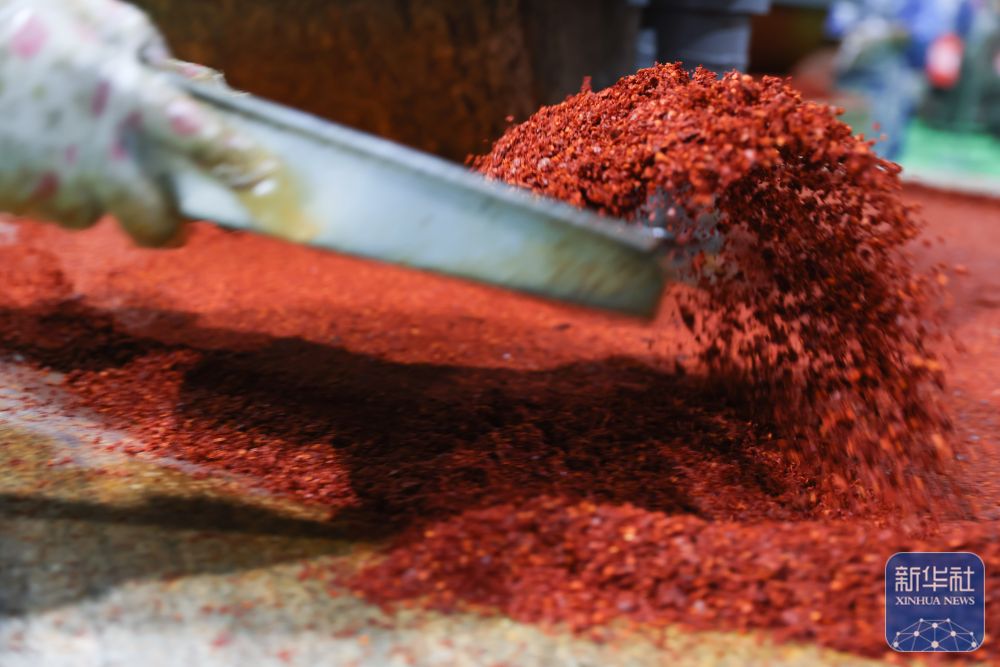 7月22日,工作人员在甘肃天水市甘谷县安远镇大城村的辣椒烘干和加工车间给辣椒粉过筛。