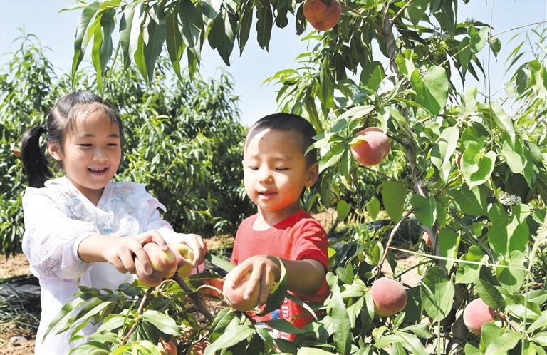 眼下,永靖县刘家峡镇城北新村集体经济产业园,蜜桃挂满枝头,一派丰收景象。目前,该村种植蜜桃面积850亩,实现产值300万元。图为果农在桃园采摘分拣蜜桃,游客体验采摘乐趣。