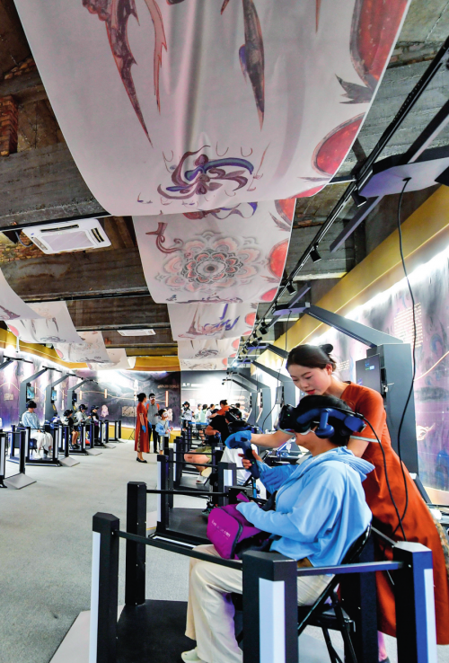 游客戴上VR眼镜,能零距离观赏莫高窟第285窟的壁画、洞窟细节,还能“飞”到窟顶,融入壁画故事情节,沉浸式感受敦煌文化魅力