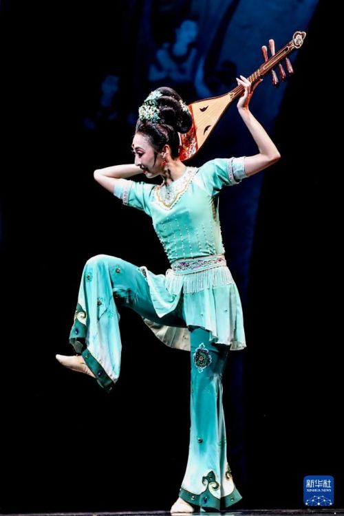 9月20日晚,演员在敦煌大剧院表演新版《丝路花雨》,展示经典舞姿“反弹琵琶”。新华社记者 郎兵兵 摄