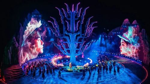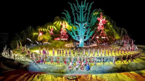 山川为幕,星河作景,置身天地间,与白马人共赴秘境奇旅。技术创新是《白马盛典》的亮眼名片。360度旋转观众席搭配“声光电”环形舞台,让观众始终身处演出核心,沉浸式感受“一镜到底”的全景体验;3D投影、超大LED屏、高空威亚、AR增强现实、全息技术等特效融入其中,随剧情推进,观众席“移步”、舞台“易景”,场景动态切换的巧思,让观演体验更具冲击力。