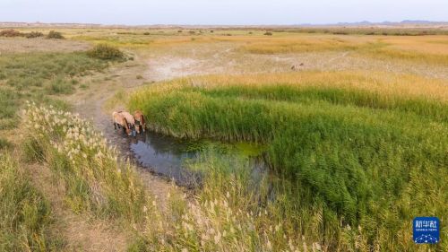 9月24日,普氏野马在甘肃敦煌西湖国家级自然保护区内饮水(无人机照片)。
