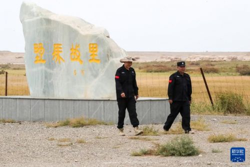 9月24日,甘肃敦煌西湖国家级自然保护区管护中心玉门关保护站站长吴兴东(右)与工作人员巡视保护区内普氏野马活动情况。