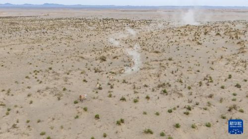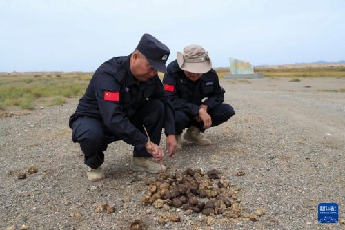 9月24日,甘肃敦煌西湖国家级自然保护区管护中心玉门关保护站站长吴兴东(左)和工作人员在野外查看普氏野马粪便。
