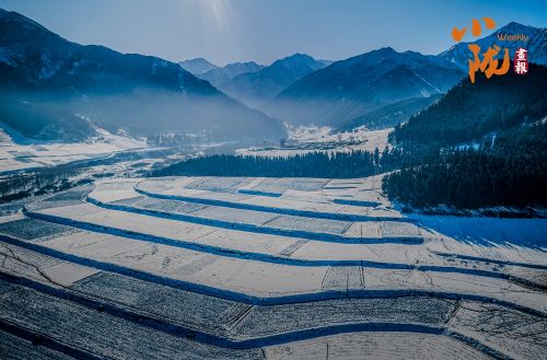 融雪斑驳似玉,在阳光的映照下熠熠生辉。轻柔铺展的白雪将起伏的山峦、静默的松林和山乡小居悉数包裹,尽展初冬的浪漫与诗情画意。